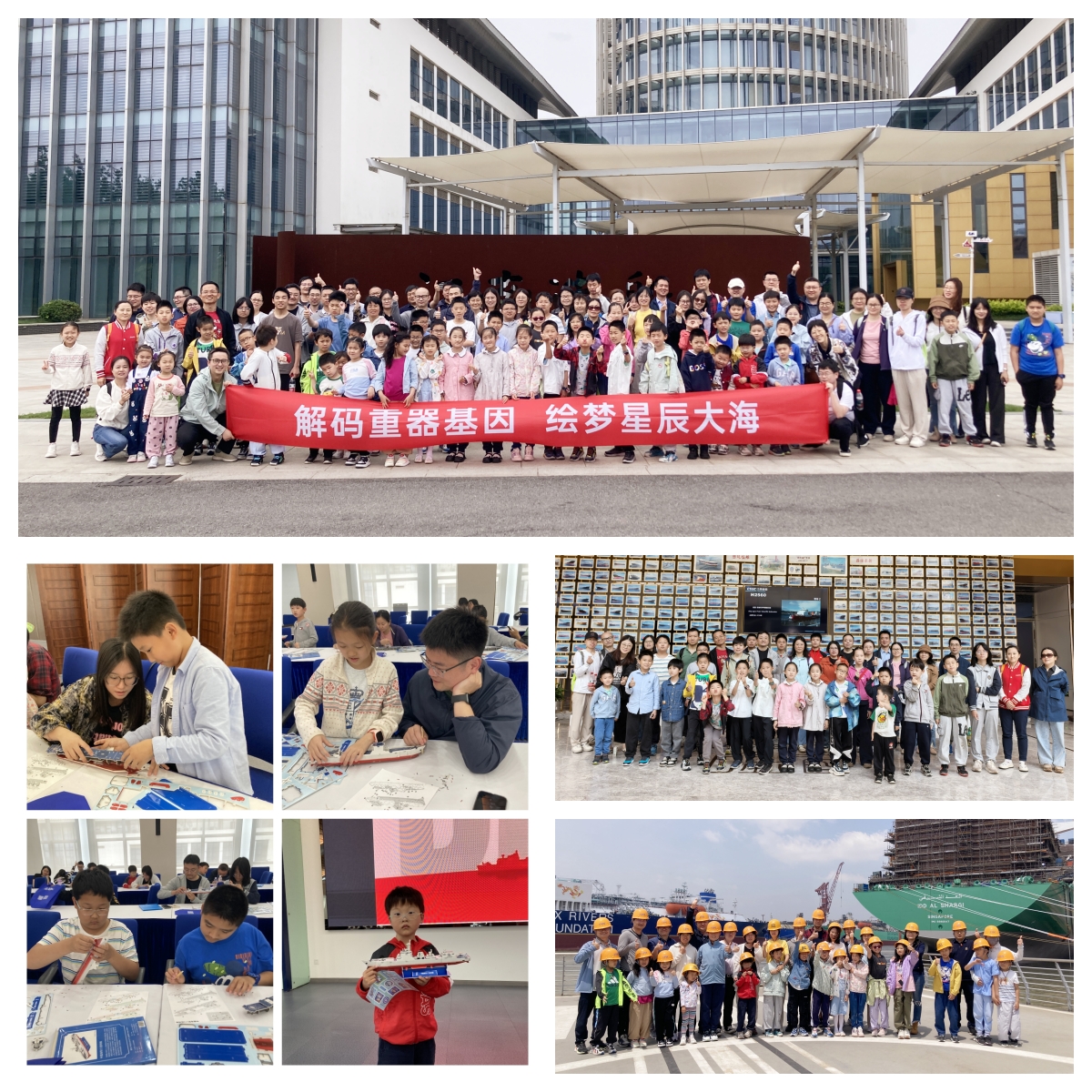 隨著大巴駛入長興島,小朋友們一起戴上黃色的安全帽,開始了對這座超級造船工廠的“基因庫”探秘之旅。在江南造船展示館,小朋友們跟隨講解員的腳步穿越“時光隧道”,親歷中國造船業的滄桑變遷,聆聽百年江南發展歷史,體會百年江南人的追夢歷程。來到生產現場,抬頭仰望巍峨的現代化船塢和巨型龍門吊,小朋友們親眼目睹鋼鐵巨輪如何在“搭積木”般的分段建造中初具雛形,學習先進造船知識,探尋世界最大、最先進級別船舶誕生的秘密。在大國重器實踐課上,小朋友們還化身船舶工程師,與科學家父母們一起組裝昆明號驅逐艦模型,拆解船舶結構,對每一個零件都精益求精,力求最后零誤差拼接。