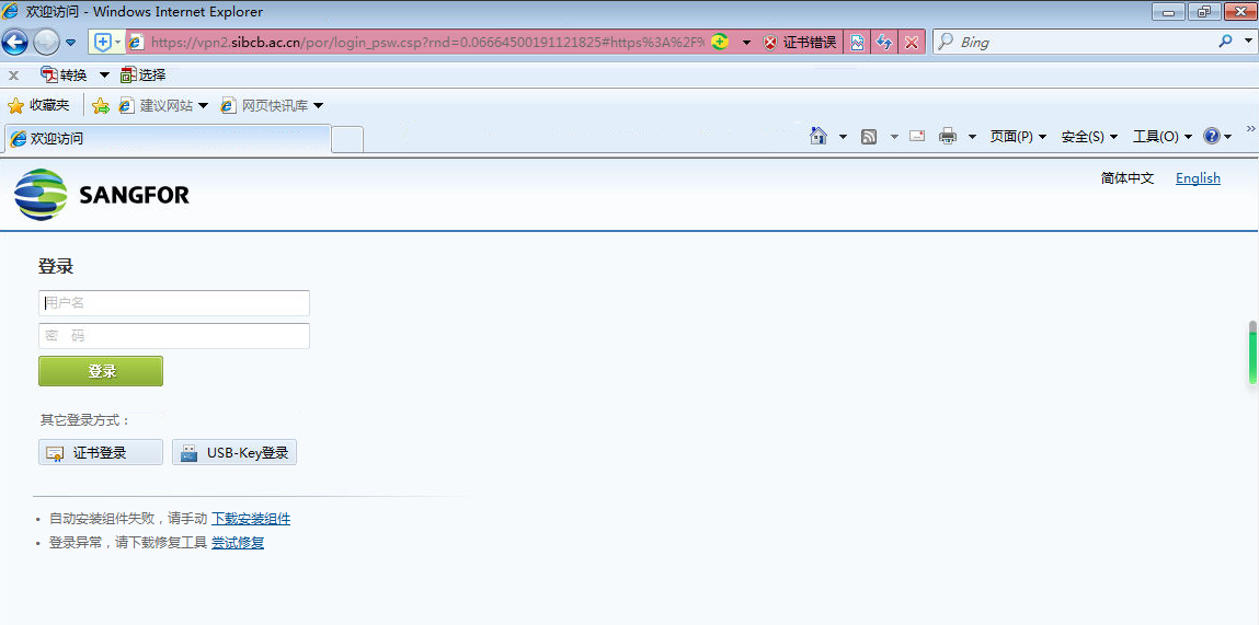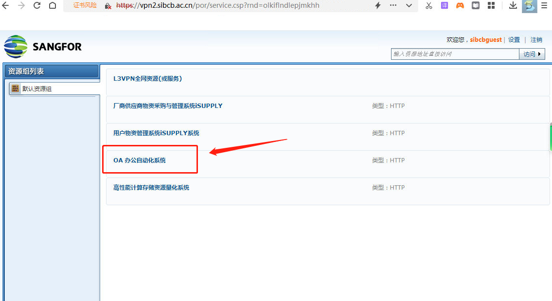 2.使用VPN用戶名和密碼進行登錄,如無VPN賬號請聯系support@sibcb.ac.cn。首次使用系統會自動安裝組件,若不成功,請手動下載安裝組件。 3.組件安裝成功后,系統會在您的電腦桌面上生成一個快捷鏈接的圖標(EasyConnect)   4.登錄成功后請點擊"OA辦公自動化系統"進入   5. VPN每次使用完畢請注銷。不可以時登兩個VPN,如有其他正在連接的VPN,請先注銷然后再登錄我們的VPN。   6.如有問題請發送郵件到support@sibcb.ac.cn。
