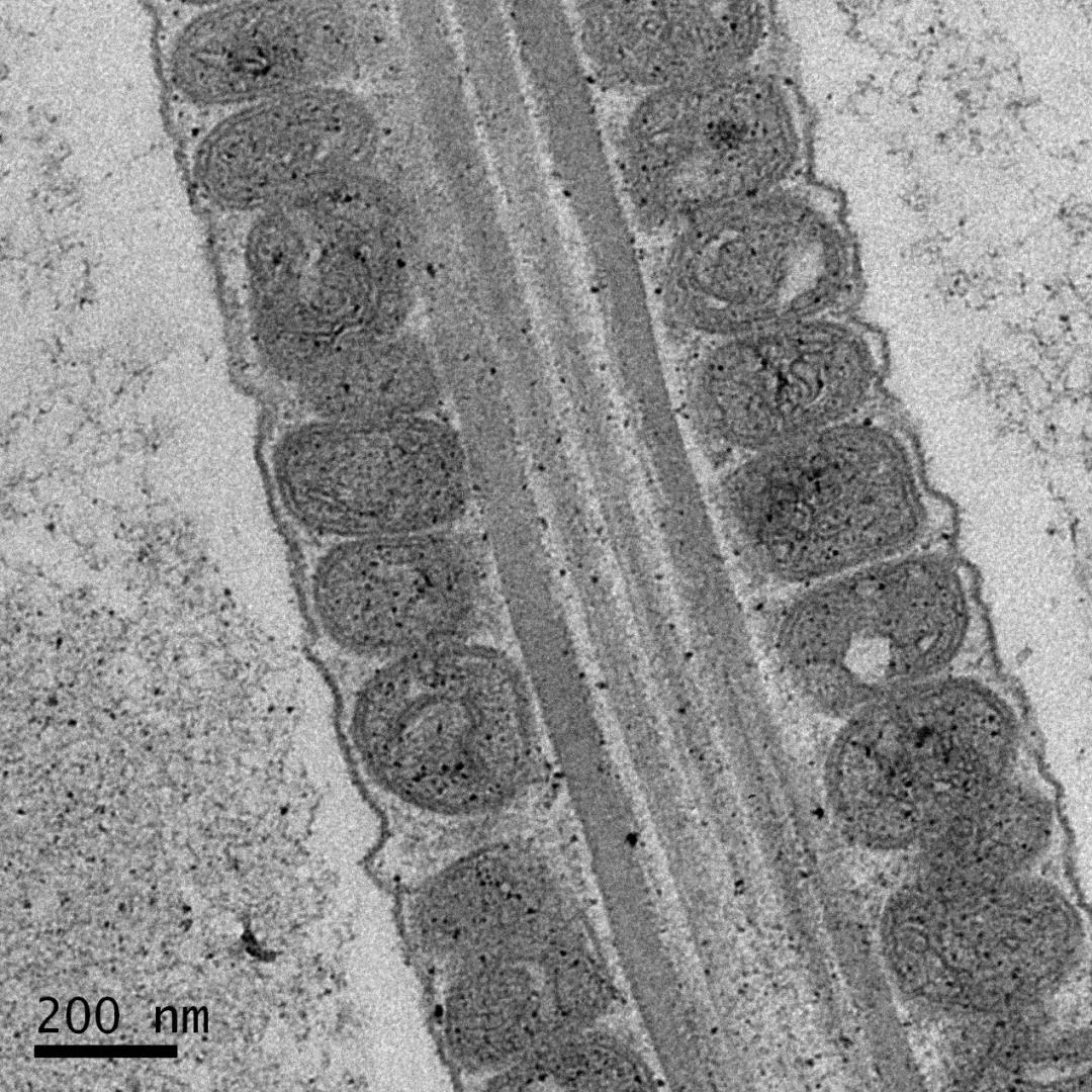 透射電鏡下可以看到小鼠精子尾巴中間的軸絲周圍密布著特化的線粒體,為精子的游動提供充足的能量。