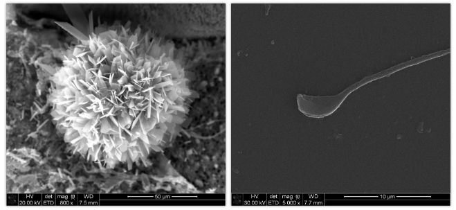 掃描電鏡的圖更像是“描繪顏值”,左圖中這朵50微米大小的“雪絨花”由渦蟲皮膚表面粘液和制樣時的結晶鹽形成。右圖為單個小鼠精子。