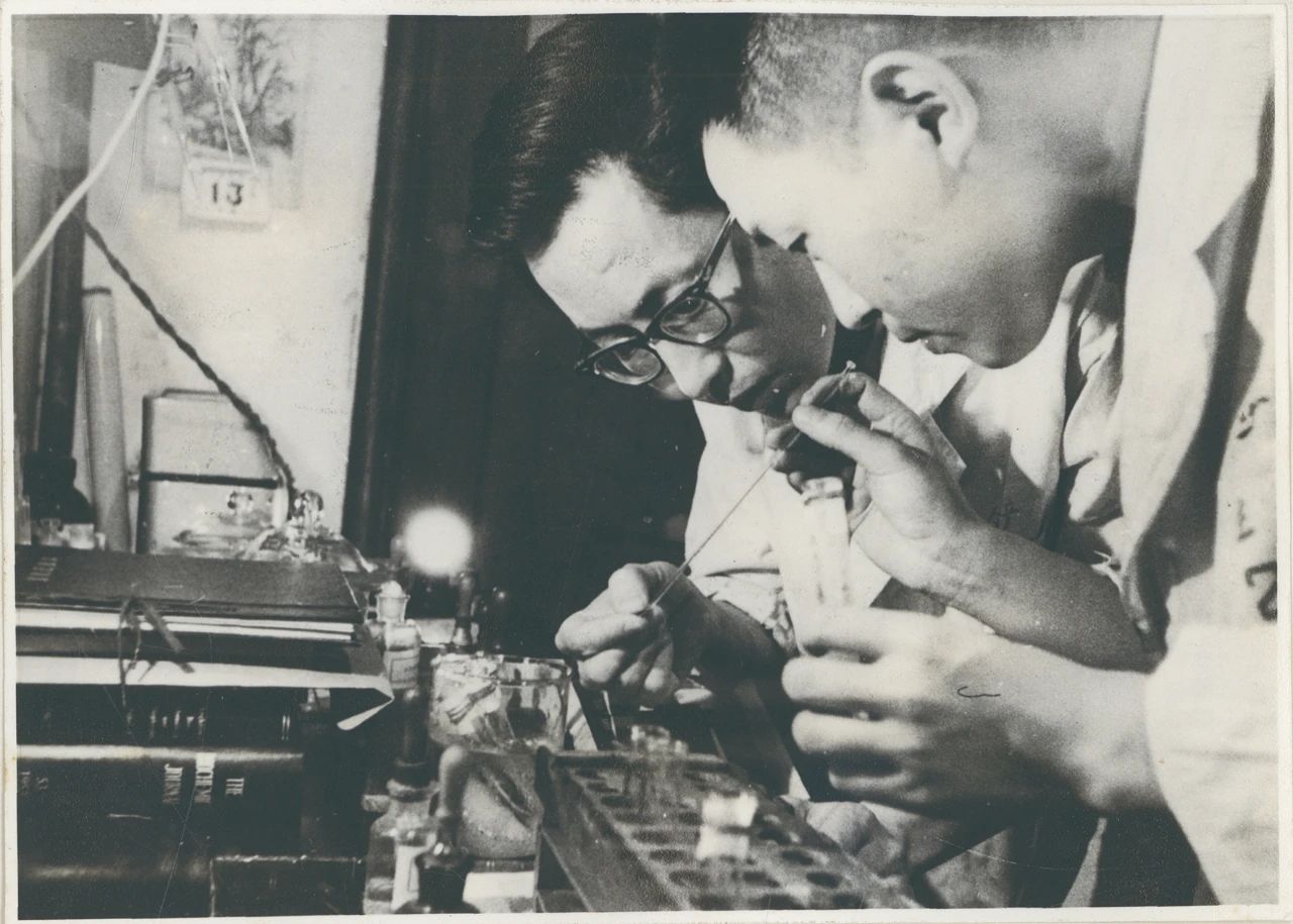 生化所龔岳亭(左)、蔣榮慶觀察人工合成牛胰島素B鏈和天然牛胰島素A鏈重組半合成胰島素的結(jié)果。