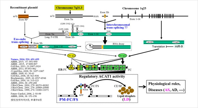 ????????Fig. 1 簡要總結我們研究人ACAT1進展的概況與重點,已在國際有影響力學術期刊上發表通訊或共同通訊作者研究論文10多篇,發明專利獲授權的5項、申請中的8項。主要工作是:發現ACAT1調控免疫殺傷 T 細胞的抗腫瘤活性和創建基于膽固醇代謝的抗腫瘤新方法(Nature, 2016),該工作被評為2016年中國科學十大進展、中國生命科學領域十大進展;發現ACAT1引起APP-alpha加工變化,提出ACAT1調控細胞質膜游離膽固醇動態模型(ABBS, 2015);發現ACAT1 56-kD蛋白來源于內-外源性反式剪接的mRNA翻譯,提出相應的內-外源性反式剪接模型(Cell Res, 2013),對生命體的共生學說具有重要意義和補充該反式剪接模型進教科書;發現miR-9降低THP-1來源巨噬細胞的ACAT1活性和抑制泡沫細胞形成(ABBS, 2013);發現TNF-alpha可直接上調分化中單核細胞的ACAT1表達而促進泡沫細胞形成(JLR,2009);揭示人ACAT1 mRNA 的5'非翻譯區通過促進其mRNA快速降解影響蛋白翻譯產生(ABBS, 2009);揭示人ACAT1 56-kD蛋白產生需要其mRNA 跨染色體區域的RNA莖環結構(Cell Res, 2008);發現來自兩條染色體、反式剪接成熟的人ACAT1 mRNA翻譯一種56-kD異構體酶(JBC, 2004);發現糖皮質激素地塞米松(Dex)促進泡沫細胞形成,揭示Dex增強人ACAT1基因表達的分子機制 (Cell Res, 2004);發現人ACAT1 mRNA 5'-ORF-AUG上游穩定莖環結構具有增強選擇下游起始密碼子翻譯的功能作用(ABBS, 2004);揭示干擾素-gamma與ATRA作用人單核細胞而協同調控人ACAT1基因P1啟動子的轉錄活性(JBC, 2001)。