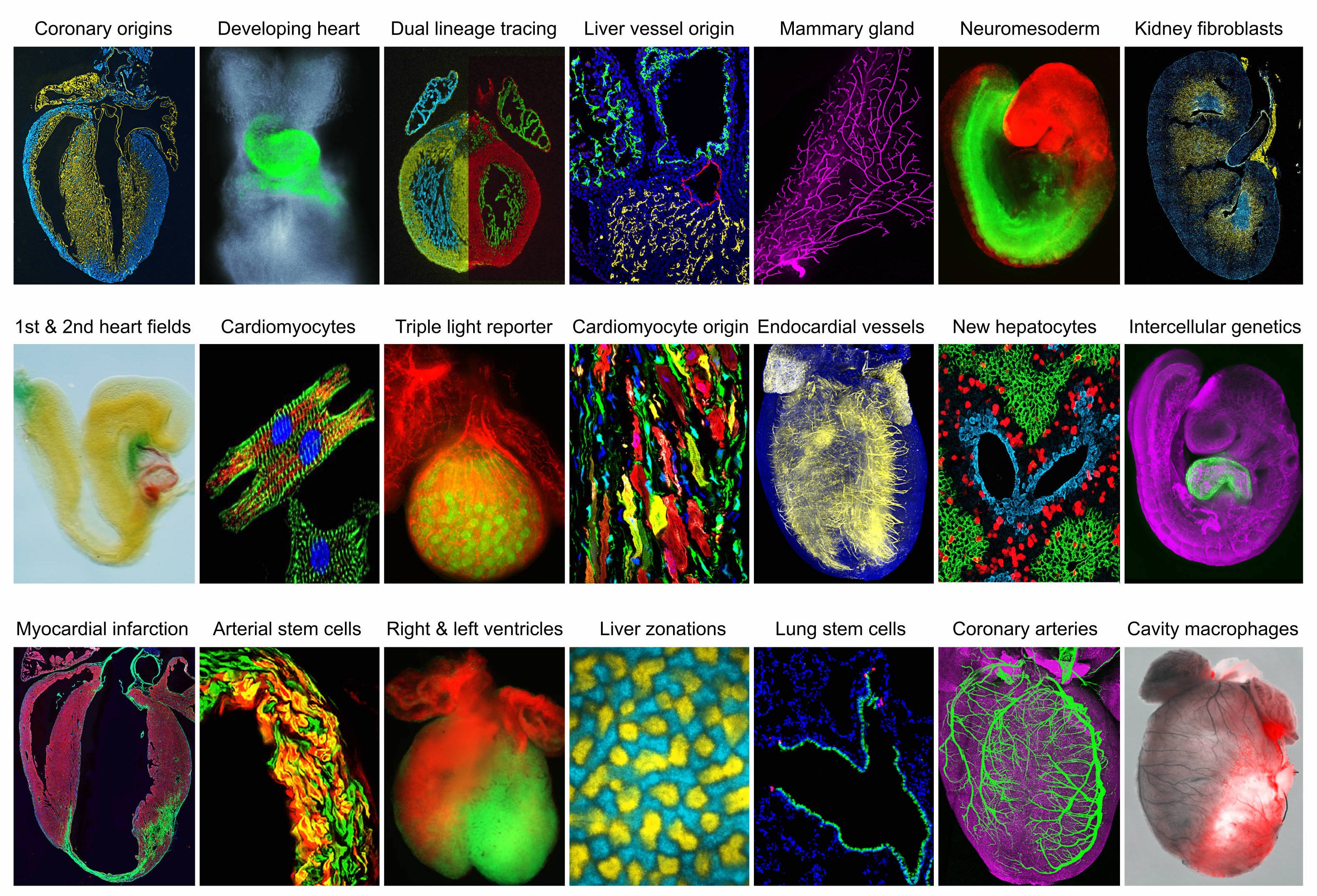 研究組主要利用基于同源重組酶系統的遺傳譜系示蹤技術,在哺乳動物體內進行細胞標記及追蹤來研究細胞起源及命運,揭示發育、疾病、再生過程中的細胞分化、增殖、衰老、死亡等細胞命運過程,并闡明細胞命運調控的分子機制,為相關疾病治療提供重要理論基礎和新的研究方向,解決了領域內多個重要科學問題,取得系統性原創成果。代表性研究工作發表在Cell、Nature、Science等國際學術期刊,其中發現哺乳動物新生期心臟具有重新生成冠狀動脈的能力的成果入選“中國科學十大進展”;創建的譜系示蹤新技術解決了近20年來國際心血管領域內關于心臟干細胞與心肌再生的爭議問題;建立了雙重組酶介導的遺傳學技術和鄰近細胞遺傳學技術,從全新的角度揭示了器官發育與修復再生的調控機制。目前,我們的研究主要包括以下幾個方面: