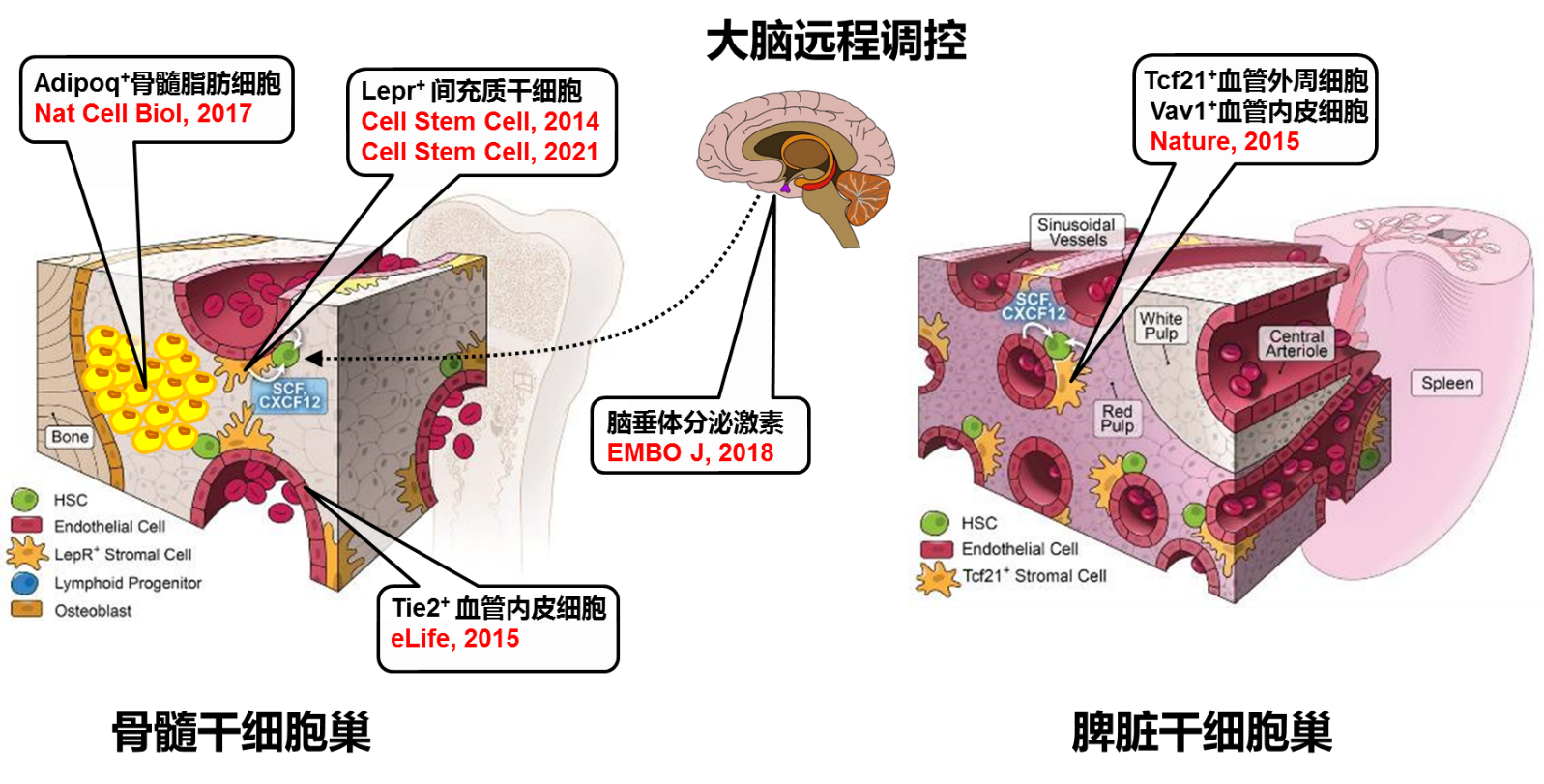 本研究組以小鼠為主要研究模型,以骨髓為主要研究器官,以譜系示蹤(Lineage-tracing)、條件性基因剔除(Conditional gene knockout)和單細(xì)胞組學(xué)(Single-cell -omics)為主要研究手段,探索成體干細(xì)胞和腫瘤干細(xì)胞的異質(zhì)性及其賴以生存的微環(huán)境(巢,niche)。目前的研究內(nèi)容包括: